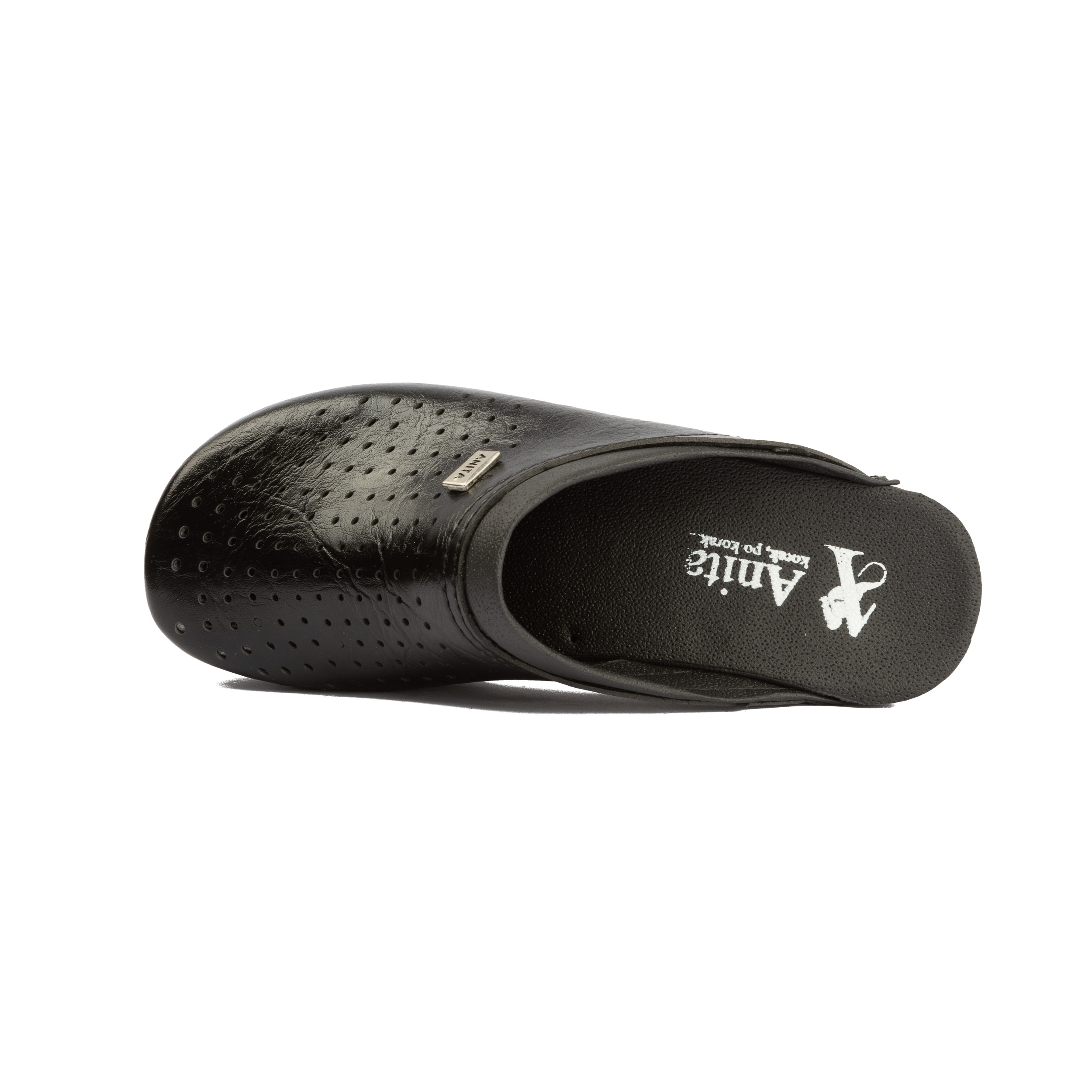 Ženska klompa izrađena od ekološke kože sa ventilirajućim rupicama i kožnom tabanicom koja sadrži masažni gel. Đon je naparvljen od poliuretanske mase..